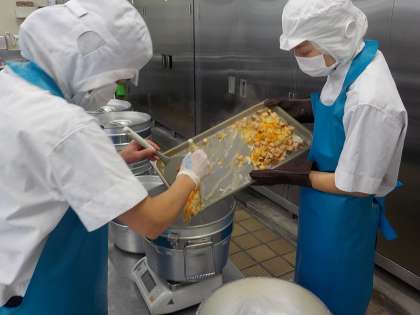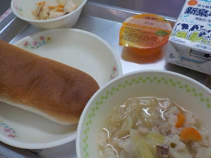 今日の献立は『コッペパン・牛乳・米粉マカロニスープ・鮭のオーブン焼・フルーツゼリー』でした。「鮭のオーブン焼」は,久しぶりの実施でした。角切りの鮭ににんじん・たまねぎとマヨネーズ風ドレッシング・淡口しょうゆ・こしょうを混ぜ合わせたものをかけて,オーブンで焼きました。お味はいかがでしたか?