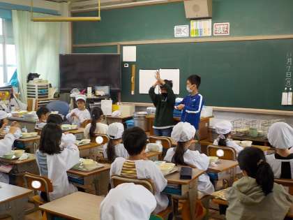 給食時間に、1〜4年生に手洗いの仕方を伝えに行きました。