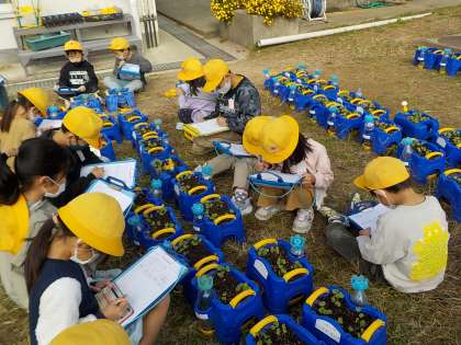生活科で,二十日大根の観察へ行きました。かわいい芽が出ています。成長が楽しみです。