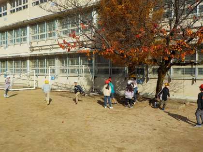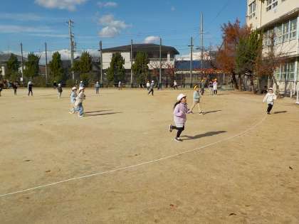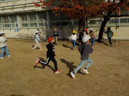 お昼の休み時間にみんな遊びをしました。元気いっぱい,おにごっこを楽しみました。