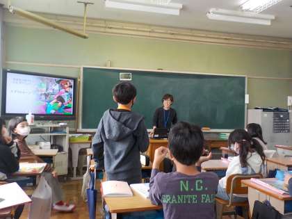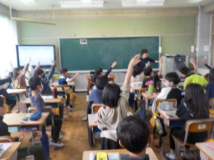 5年生になって初めての外国語の学習です。自己紹介を交えながら取り組みました。