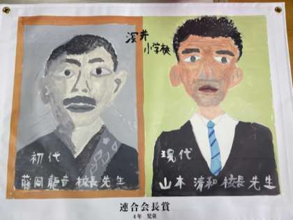 夏休みの自由課題であった 深井にまつわる絵画で、連長賞、事務局長賞、実行委員長賞、校長賞、教頭賞に選ばれた作品が、学校の周りに飾るため、拡大し、防水のものにできあがりました。