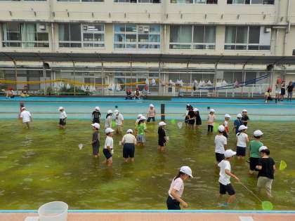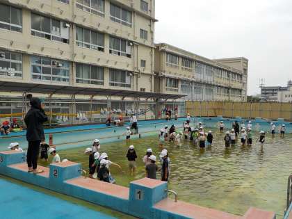 本日、3年生はプールで「ヤゴ取り」をしました。プール清掃前のプールには、ヤゴやアメンボなどの生き物が見つかりました。保護者の皆様、服装などのご準備ありがとうございました。