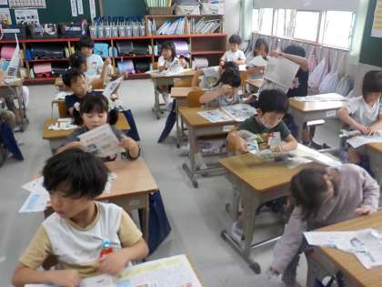 新聞紙を破いて、何の形に見えるかを考え、