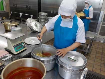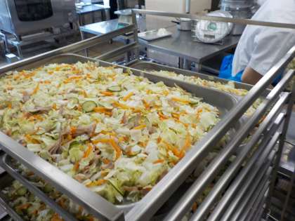10月にG7貿易大臣会合が大阪・堺で開催されます。それに合わせて、堺市の学校給食ではG7の国々にちなんだ給食を実施しています。今日は、イタリアです。「イタリアンサラダ」は、にんにく・たまねぎ・トマトピューレ・油・砂糖・塩・こしょうを合わせて、火にかけて作ります。