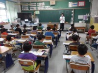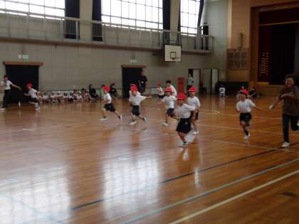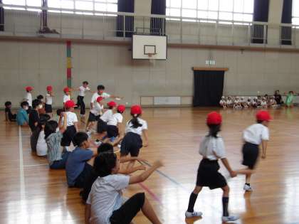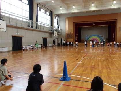 体育では、シャトルランを実施しています。6年生がお手伝いをしてくれています。