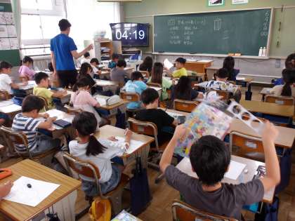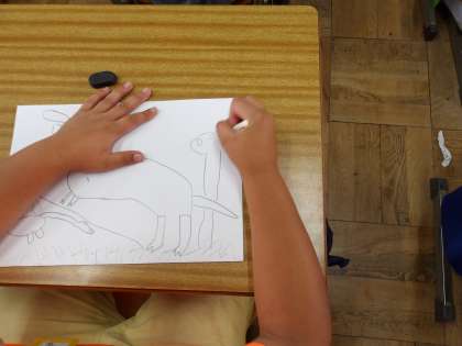 図工「動いて楽しいわりピンワールド」では、そんな世界を表現するか、下書きをしてから制作します。テーマにあがったのは、水族館・恐竜館・公園野球・昆虫館・お花畑・・・どんな世界ができるのか、楽しみですね。