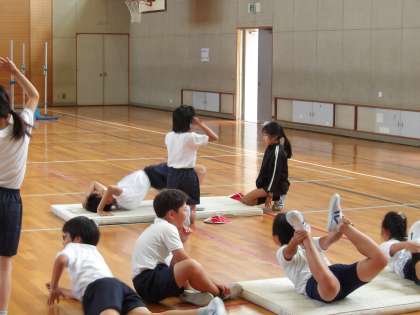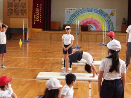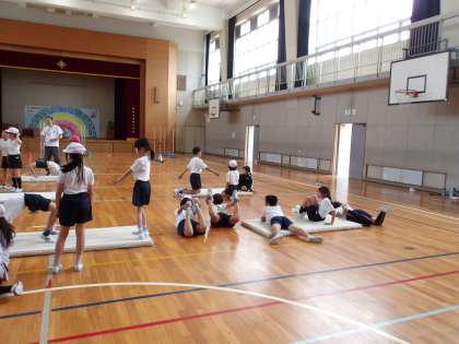 体育のマット運動では、ブリッジの技に取り組んでいます。