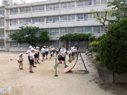 体育では、鉄棒運動の逆上がりの学習をしています。補助具を使ってできるようになった人がたくさんいるようです。
