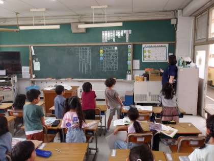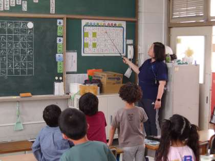 国語では、先生が示すひらがな表の文字を見ながら、大きな声で答えています。