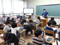 保健だよりの配布に合わせて、学校水泳について話をしています。