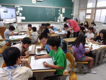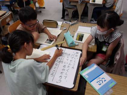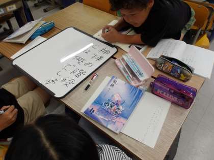 国語では、今日から「神様の階段」の単元に入りました。作者の一番伝えたいところやおもしろいところは何か、班で「問い」を考えます。