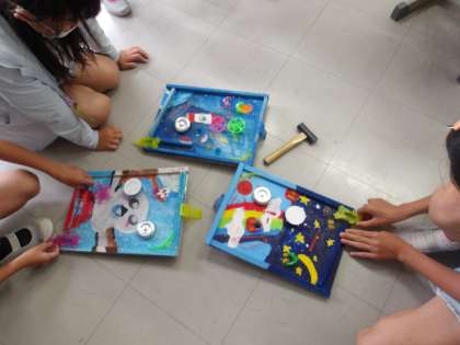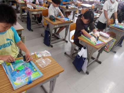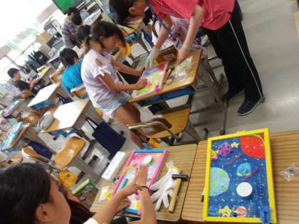 図工「コリントゲーム」の最後の仕上げになっています。出来上がった人が、ゲームをしています。