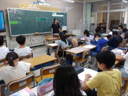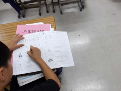 英語では、授業の初めにアルファベットのかき方を学習します。今日は「Q」と「R」です。小文字の「r」は、丁寧に書かないと「n」や「v」と間違ってしまうことがあるので注意が必要です。