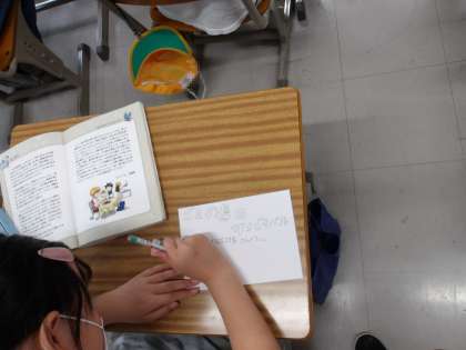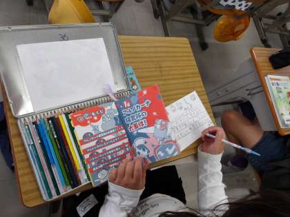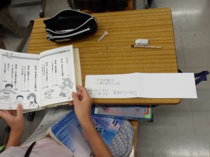 国語「本のポップや帯をつくろう」では、読んでみたいと思ってもらえるように、心に残った文を引用したり、キャッチコピーを書いたりして帯をつくります。