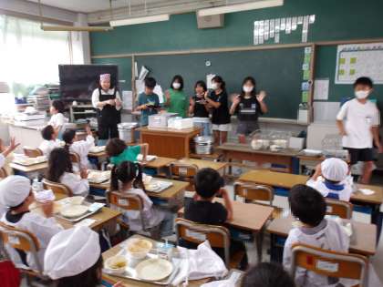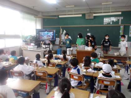 来週火曜日に、6年2組が1年生を招待して夏祭りを行います。遊び方などのお話をするために1年生の教室に来てくれました。楽しみですね。