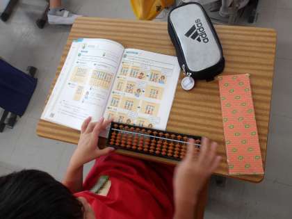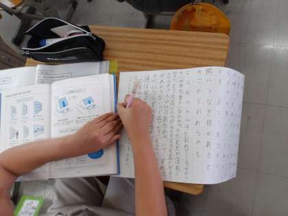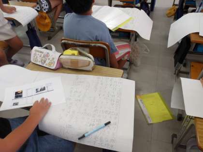国語と総合的な学習の時間の合科授業です。防災について調べたことを、新聞づくりで学習したことをいかして、本などを活用してオリジナルの新聞を制作しています。