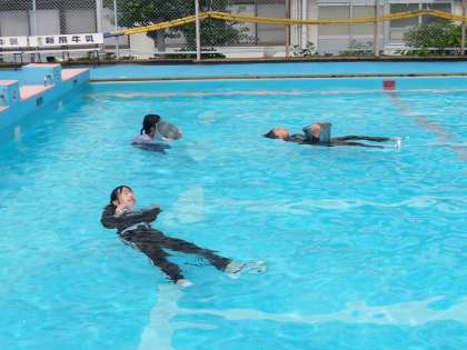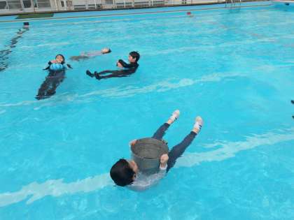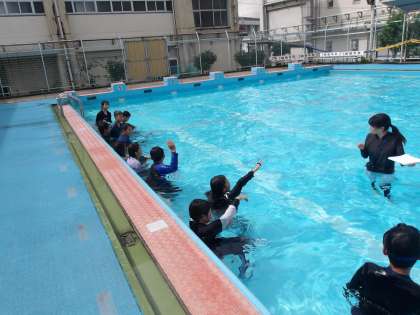 5年生は、今年度最後の水泳授業です。今日は、着衣水泳の学習です。