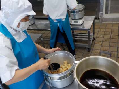 「チキン南蛮」は、オーブンで焼いた鶏のから揚げに、ピリ辛で甘酸っぱいたれをかけました。なにわの伝統野菜、堺鷹の爪を使った唐辛子を使いました。石臼で挽かれた唐辛子はとても細かく、ふわっと広がって香りが良かったです。みんなが食べやすいように、使った量はごくわずかでした。『おいしい!』『良い香りがする!』という声を聞くことができました。