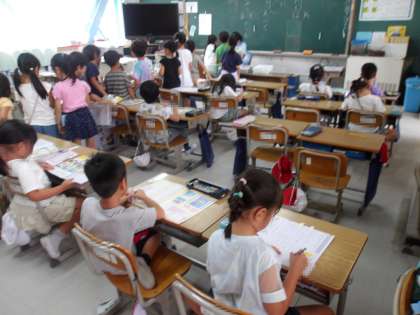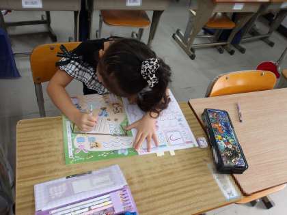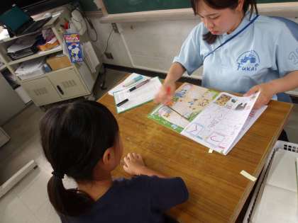 漢字の学習です。丁寧になぞります。「ぐるぐる」と書くには難しいですね。丁寧になぞっています。