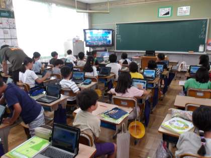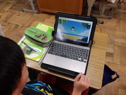 理科では、先生が作ったクイズに挑戦しながら、1学期に習ったことを復習をします。まずは、回答者の名前を自分で考えて打ち込んで、スタンバイ!