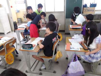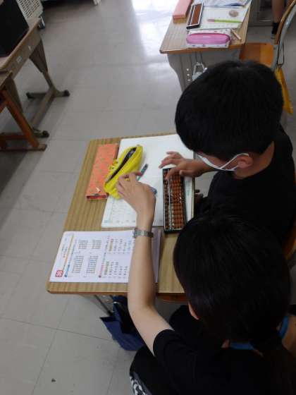 算数では、そろばんの学習をしています。今日は、小数の計算にチャレンジです。
