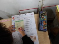 九月のカレンダーづくりをしています。コスモスの花を上手に表現しています。