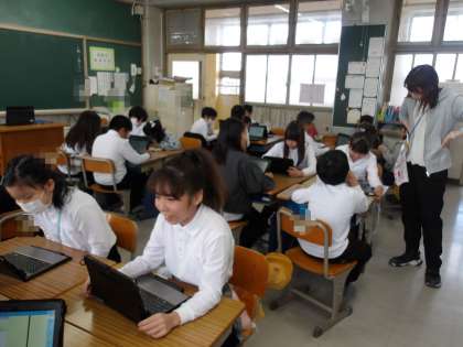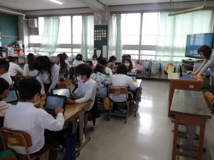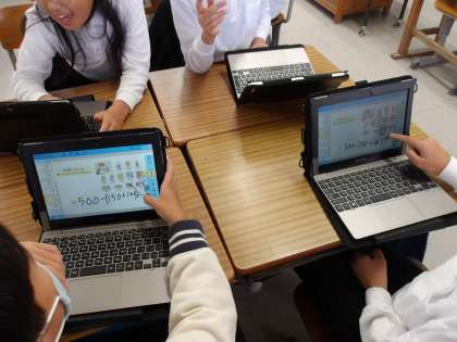 算数では、タブレットに配布された絵を見て、問題を作成しています。