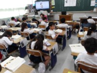 体育館での体育では、ソフトバレーボールを使ってドッチボールが行われています。積極的にボールを投げたり、キャッチしたりしています。