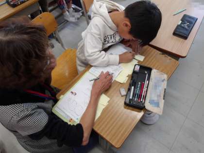 漢字の学習です。先生に直したところを見てもらっています。終わった人は、タブレットのドリルパークに取り組んでいます。