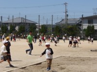 青空のもと,元気に先生と一緒に外遊びを楽しんでいます。