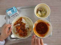 今日は,お楽しみ献立です。寒天を使った「とろりフルーツコンポート」がデザートです...