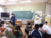 書写では,「元気」の書初めをしています。先生が説明する気を付けるところを聞きなが...