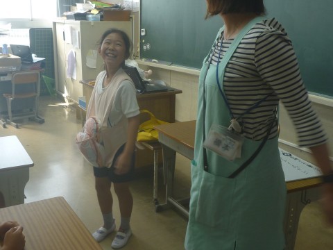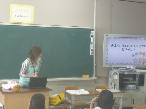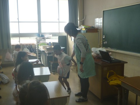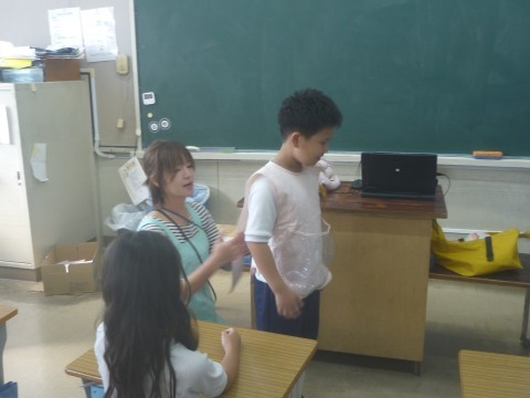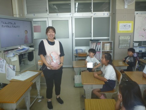 妊婦体験も行い,子どもたちは「お母さんはこんなに大変な思いをしてくれてたんやー」