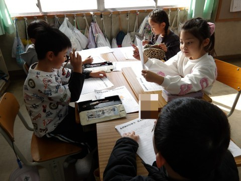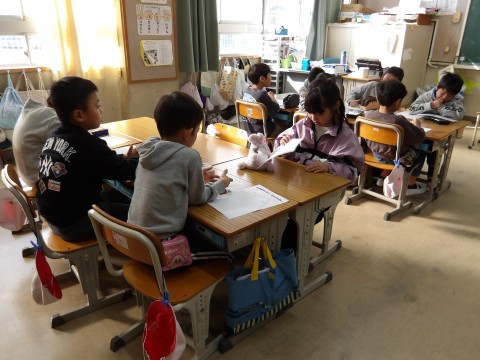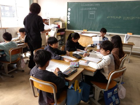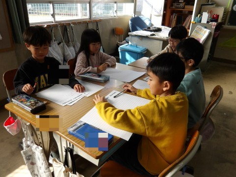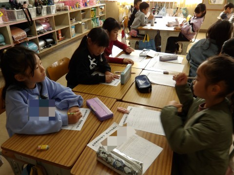 「町たんけんで」でいろいろ教えていただいたことを班で発表する準備を行っています。
