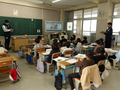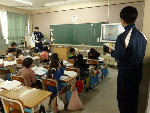 教職員の仕事の様子を観察しながら,児童との関りも学んでいます。