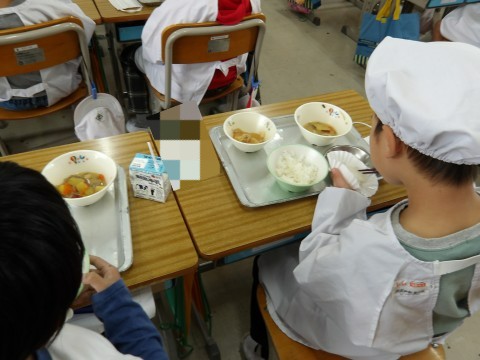 今日の献立は,「牛乳・ごはん・さつまじる・にくだいこん・ういろう」でした。