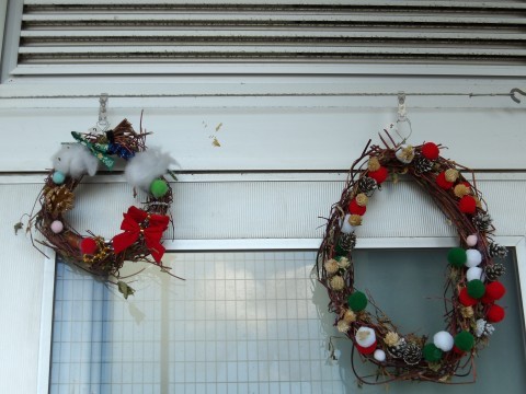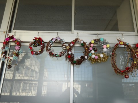 あさがおのつるで作ったリースに飾りを付けて「クリスマスリース」を作りました。
