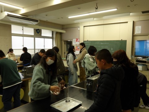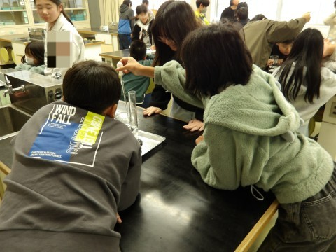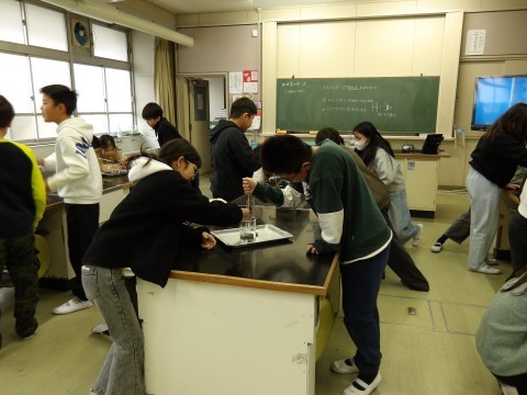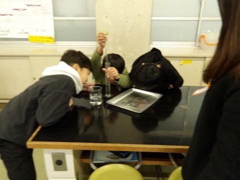 メスシリンダーにスポイドを使って決められた分量を量る練習を行いました。