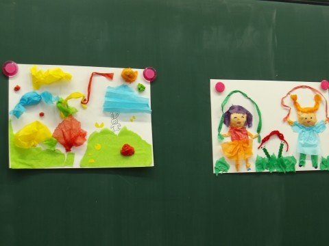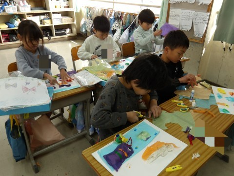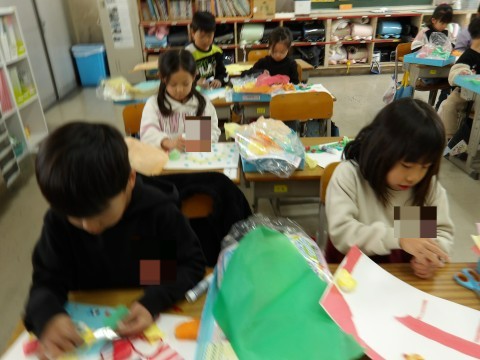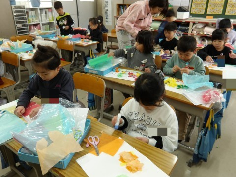 花紙をそのまま貼るだけでなく,少し丸めて貼ることで立体感も出るように工夫して取り組んでいます。
