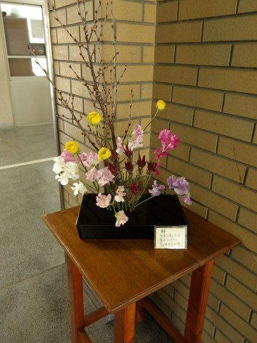大寒波が来て,寒い日が続いていますが,今週は「桜」の花を飾っていただき,暖かさを感じる色合いの花を生けていただいています。