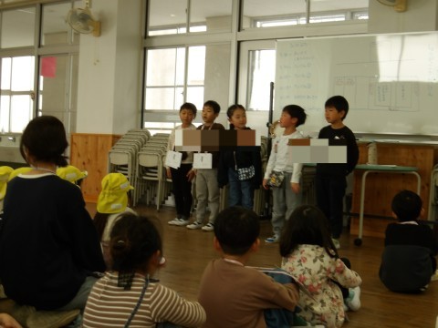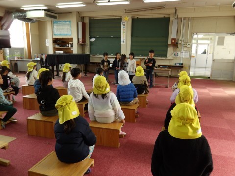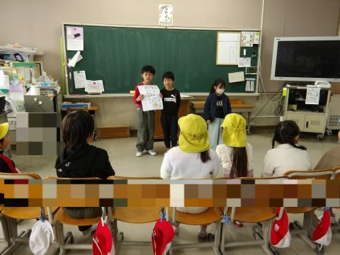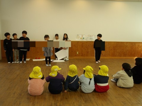 1年生児童は,学習参観で行った各教科に分かれた発表を園児向けに少しアレンジして進行しました。
