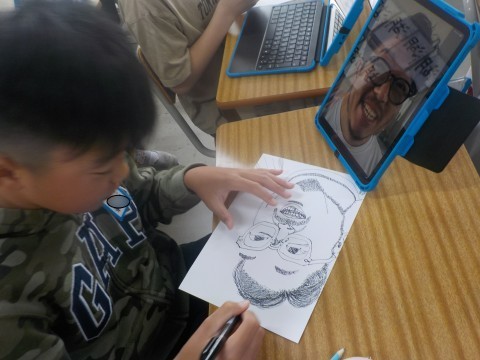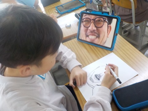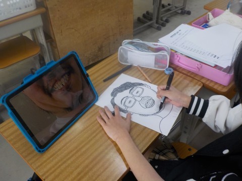 タブレット端末を活用して,担任の顔を描いています。どの人も味のある作品に仕上げることができ,お互いの作品を見合うことで,自然に笑顔あふれる時間となりました。毛の生え方やしわなどを意識して,丁寧に画用紙に描きこむことができました。