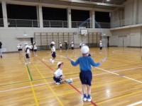 体育館体育で縄跳び練習を始めました。前跳び・後跳び以外のいろいろな跳び方もできる...