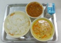 今日の給食のメニューは ごはん 牛乳 たまごスープ ドライカレーです。