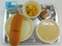 今日の給食のメニューは 黒糖パン 牛乳 クマラスープ 焼きウインナー 野菜ソ...