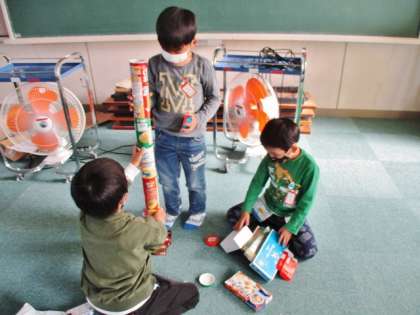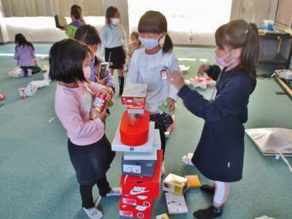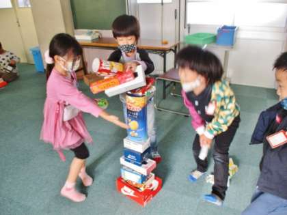 箱の形を意識しながら、協力して高く高く積み上げます。