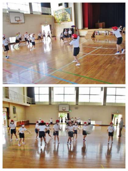 ドッジビーとラグビーボールを使ったドッジボールを楽しんでいます。