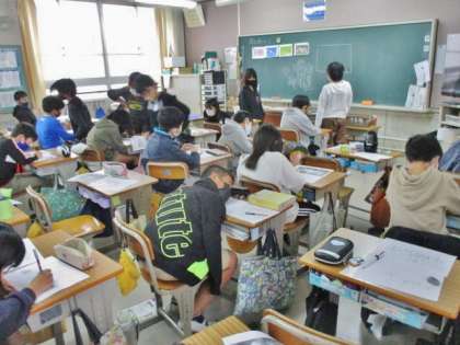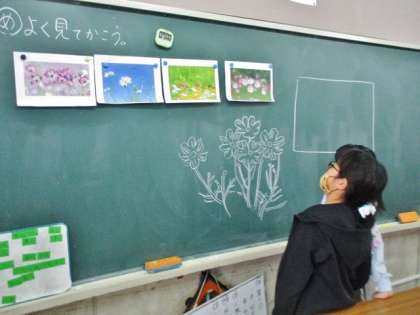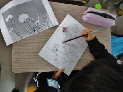 校舎を背景に咲く花を描くために、鉛筆で花を描く練習をしています。