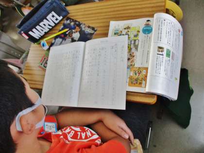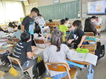 書きあがった文章をお互いに見せ合っています。